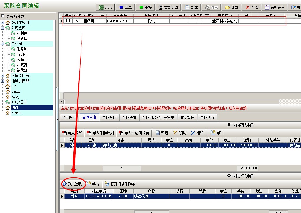 打開采購合同內(nèi)容,點(diǎn)擊合同執(zhí)行明細(xì)的[到貨驗(yàn)收]