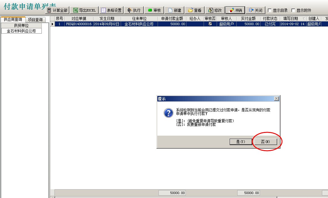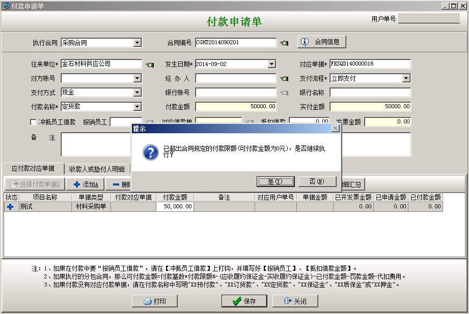 備注:上圖提示為預(yù)防超額付款的合同明細(xì)提示,點(diǎn)確定即可。
