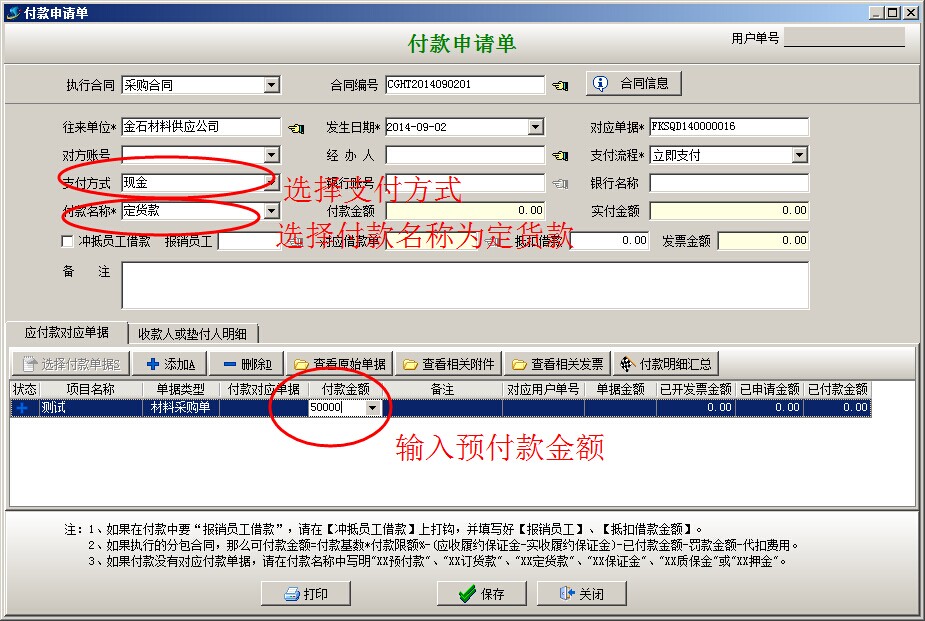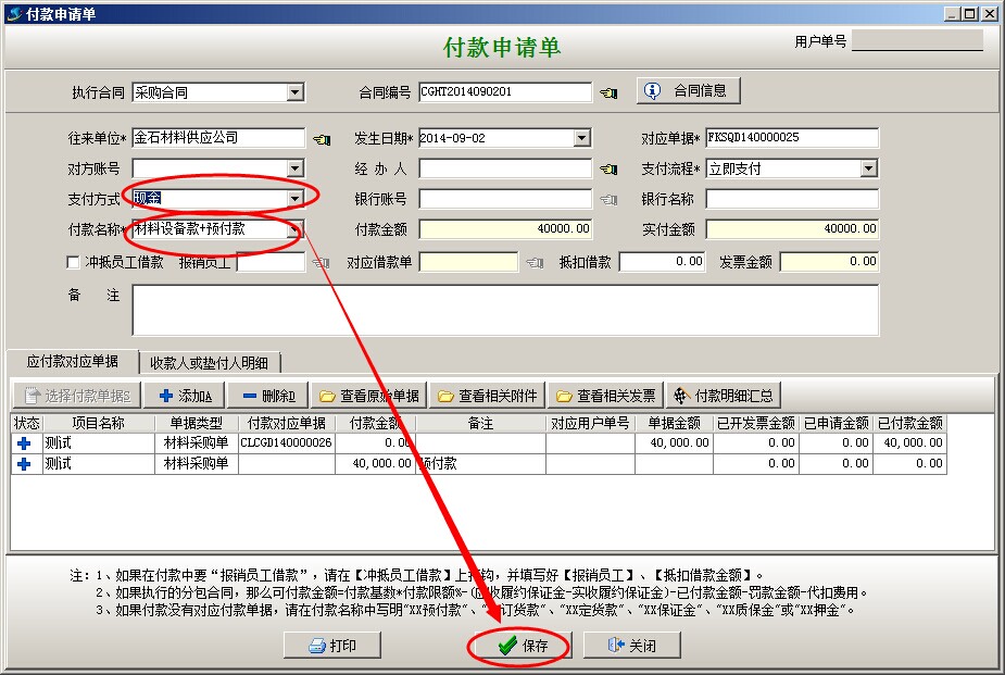 注:上圖所示;付款申請單的兩行明細(xì)為兩個材料采購單,第一行的[付款對應(yīng)單據(jù)]為CLCGD140000026已付款金額40000已經(jīng)等于單據(jù)金額(表示該采購單已經(jīng)付完,是通過上一個付款單自動對應(yīng)上的付款數(shù)),所以付款金額為0,第二行的[付款對應(yīng)單據(jù)]為空,表示本項(xiàng)支付的款項(xiàng)為預(yù)付款),上面的付款名稱為材料設(shè)備款+預(yù)付款;