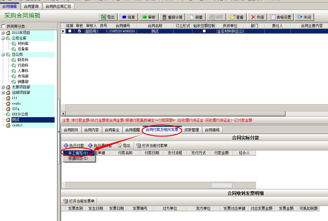 合同內(nèi)容錄入完畢,審核采購合同,在沒有執(zhí)行到貨驗(yàn)收的情況下,點(diǎn)擊合同付款及相關(guān)發(fā)票,執(zhí)行付款,選擇手工填寫,彈出付款申請單,選擇付款方式,付款明細(xì)中輸入付款金額,然后保存 。