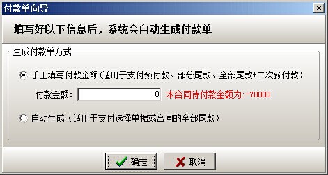 在彈出的付款單向?qū)е休斎朐俅晤A(yù)付款金額,點(diǎn)確定