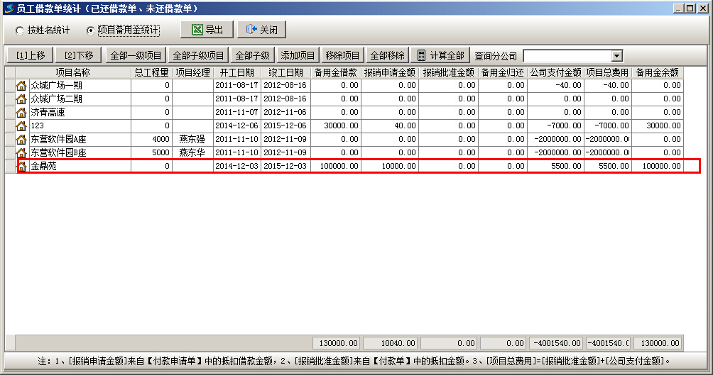 支付完成之后可在“員工借款統(tǒng)計(jì)”-“項(xiàng)目備用金統(tǒng)計(jì)”查看到對(duì)應(yīng)的項(xiàng)目備用金及報(bào)銷金額的匯總。