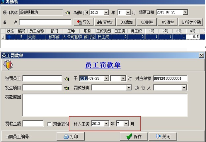1. 【員工工資】可用于統(tǒng)計(jì)公司管理人員、項(xiàng)目管理人員等固定工作人員的工資成本。員工工資表是根據(jù)員工考勤表生成,每個(gè)項(xiàng)目的考勤可以單獨(dú)錄入,但一個(gè)月份只能生成一張工資表。員工考勤的錄入比較簡(jiǎn)單,是按數(shù)字表示出勤情況的,全勤填寫1、半勤填0.5、缺勤填0。如果有遲到、早退、曠工等情況可以填寫員工罰款單來進(jìn)行扣工資。