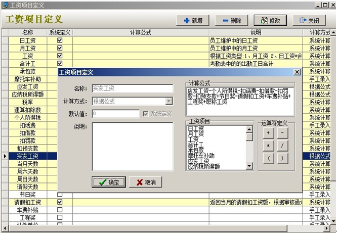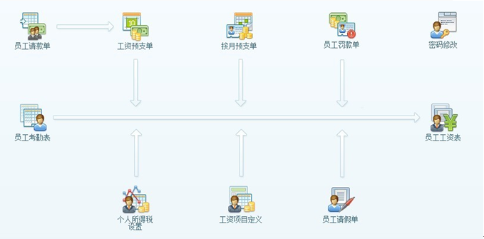 除此之外,還有根據(jù)系統(tǒng)中各業(yè)務(wù)單據(jù)自動(dòng)計(jì)算的扣工資預(yù)支、扣員工借款、扣罰款、員工請(qǐng)假單中請(qǐng)假扣工資等,還有需要手工添加的在工資項(xiàng)目定義中各種扣款、補(bǔ)助等。