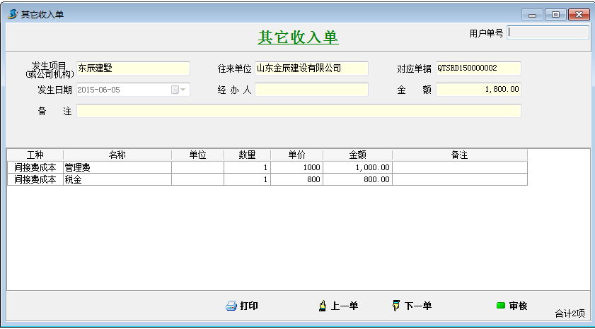 在工程項(xiàng)目資質(zhì)掛靠管理中甲方直接把承包款支付給借資質(zhì)公司(乙方B),我公司不會(huì)跟甲方產(chǎn)生往來(lái)賬款。由于是借的我方的資質(zhì),乙方B需要向我公司支付管理費(fèi)或者稅金。通過(guò)其它收入單來(lái)記錄這筆費(fèi)用。如下圖: