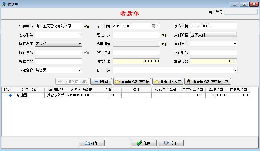 在工程項(xiàng)目資質(zhì)掛靠管理中如果收取工程款直接在[合同收款及相關(guān)發(fā)票]模塊填寫收款單,如下圖
