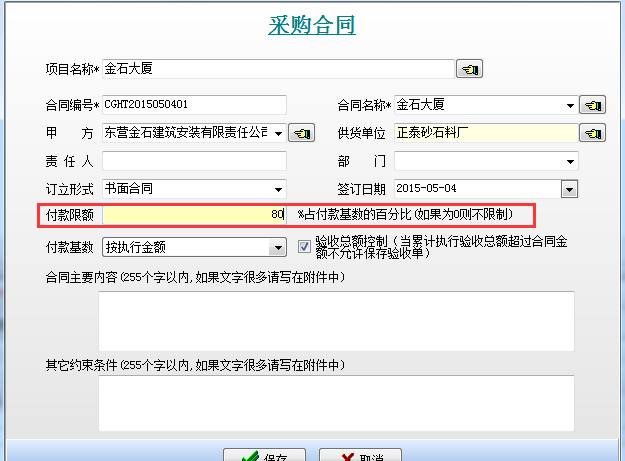 即在工程項(xiàng)目管理系統(tǒng)中新建采購合同時(shí)填寫好付款限額。如下圖: