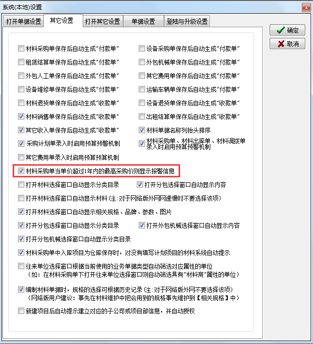 備注:獲得此項(xiàng)提示需要打開開關(guān)【系統(tǒng)維護(hù)】-【系統(tǒng)本機(jī)設(shè)置】-[其他設(shè)置]- 在[材料采購單當(dāng)單價(jià)超過一年內(nèi)的最高采購價(jià)則顯示報(bào)警信息]處打上勾 。如下圖