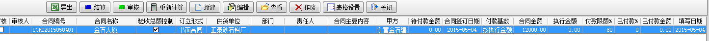 我們建立一個(gè)總價(jià)為12000的采購合同,付款基數(shù)按執(zhí)行金額,付款限額為80%。如下圖