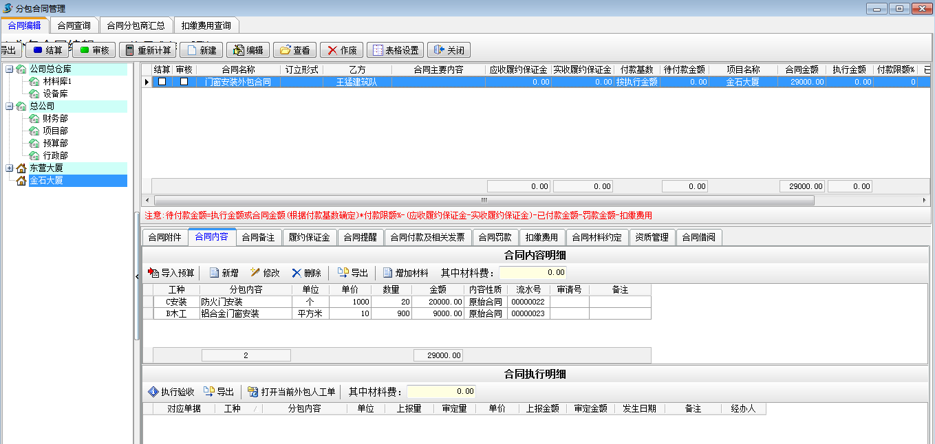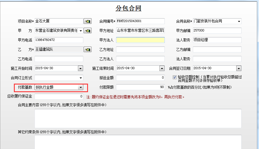 我們建立一個總價為29000的分包合同,付款基數(shù)按執(zhí)行金額,付款限額為90%。如下圖
