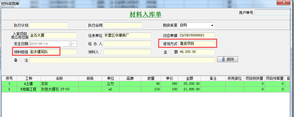 軟件中實際用量匯總是通過材料管理中材料采購單、材料出庫單、材料退庫單、材料調(diào)撥單中領料班組為當前合同乙方,項目為當前項目進行計算。如下圖: