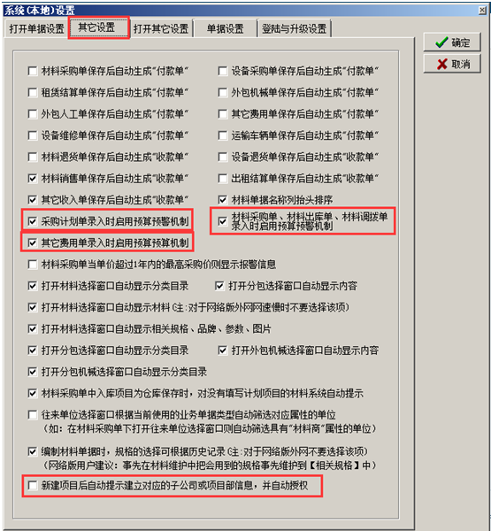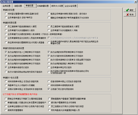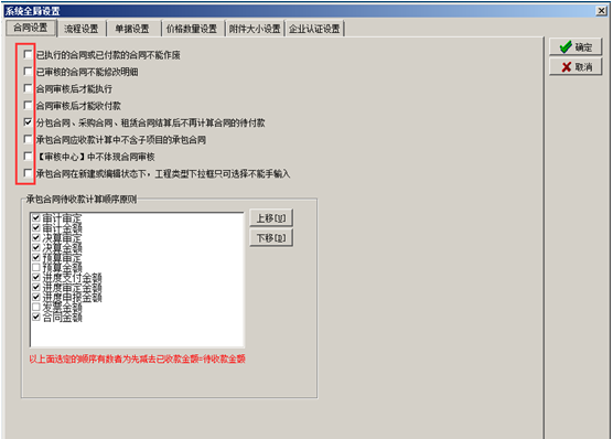 進(jìn)入系統(tǒng)的“系統(tǒng)維護(hù)”-“系統(tǒng)全局設(shè)置”彈出系統(tǒng)全局設(shè)置的對(duì)話框,點(diǎn)擊“合同設(shè)置”,在對(duì)應(yīng)的復(fù)選框打鉤代表合同受對(duì)應(yīng)開關(guān)的控制,如圖: