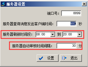 手機服務(wù)器端設(shè)置刷新時間,在電腦的右下角找到手機服務(wù)器端的圖標(biāo)點擊鼠標(biāo)右鍵,選擇“服務(wù)器設(shè)置”,在彈出的“服務(wù)器設(shè)置”對話框中設(shè)置“服務(wù)器刷新時間段”以及“服務(wù)器自動審核時間間隔”,如圖: