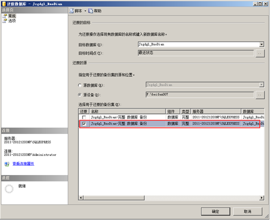 在“對象資源管理器”找到想要進(jìn)行備份的數(shù)據(jù),選中點(diǎn)擊鼠標(biāo)右鍵,點(diǎn)擊“任務(wù)”-“備份”,彈出“備份數(shù)據(jù)庫”的對話框,備份類型選擇“完整”,“目標(biāo)”是備份文件的位置,可以自定義一個(gè)比較好找的目標(biāo),這樣備份以后就可以方便的找到備份文件了,設(shè)置完成點(diǎn)“確定”即可,然后到目標(biāo)目錄下找到備份文件就是所需的備份文件,如圖: