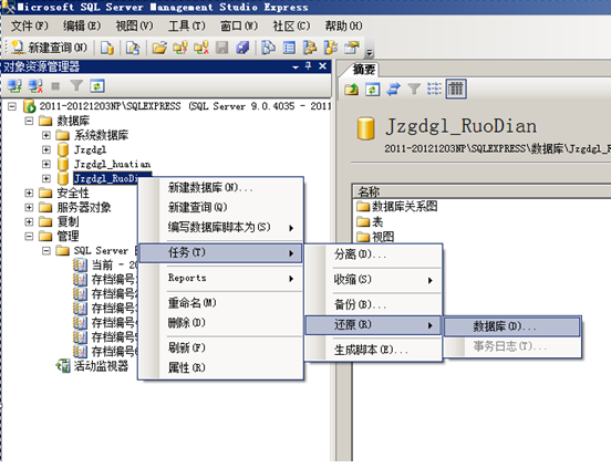 Sql2005數(shù)據(jù)還原時(shí),在“開始”-“程序”進(jìn)入資源管理器,登錄需要備份的數(shù)據(jù)庫服務(wù)器,打開企業(yè)管理器后,逐一展開,看到有數(shù)據(jù)庫項(xiàng)后,選中數(shù)據(jù)庫節(jié)點(diǎn)單擊右鍵,選擇“任務(wù)”-“還原”-“數(shù)據(jù)庫”,如圖: