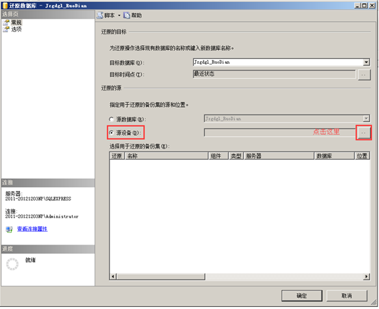 選擇“還原”后進(jìn)入“還原數(shù)據(jù)庫”窗口,目標(biāo)數(shù)據(jù)庫默認(rèn)已經(jīng)選擇需要還原的數(shù)據(jù),接著在“還原的源”中的選擇“源設(shè)備(D)”,單擊“源設(shè)備((D)”右邊的“…”按鈕,如圖: