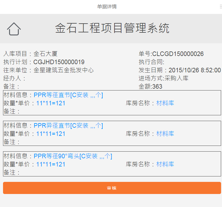 收到提醒信息后如果想審核該單據(jù)點擊“點擊審核”會自動跳轉(zhuǎn)到金石軟件手機版版(支持PC瀏覽器)界面。如下圖: