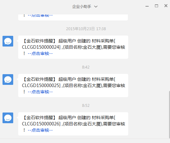 用超級用戶設(shè)置好微信認證之后在,當(dāng)單據(jù)創(chuàng)建人發(fā)起審核后,審核過程中的人都會收到微信提醒信息。微信如下圖: