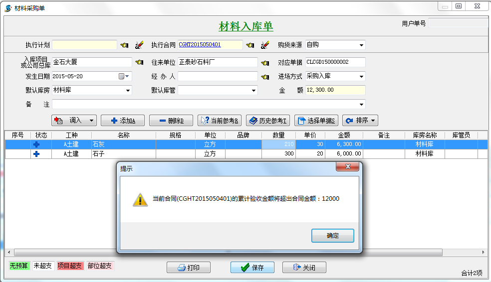 在工程項(xiàng)目管理系統(tǒng)中當(dāng)我們驗(yàn)收金額超過(guò)總額時(shí)系統(tǒng)會(huì)自動(dòng)提示,并且材料采購(gòu)單不能保存。如下圖