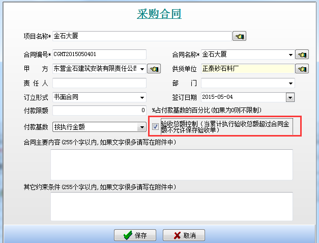 在工程管理軟件中即通過(guò)采購(gòu)合同驗(yàn)收總額控制選項(xiàng)來(lái)控制驗(yàn)收總額。