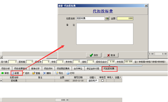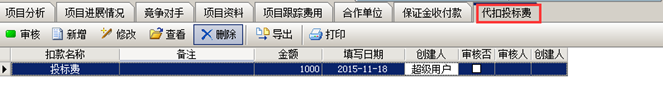 在聯(lián)營項(xiàng)目中,還回投標(biāo)保證金時(shí),如果有“代扣投標(biāo)費(fèi)”,則在工程管理軟件的項(xiàng)目開拓中建立“代扣投標(biāo)費(fèi)”單據(jù)。如圖: