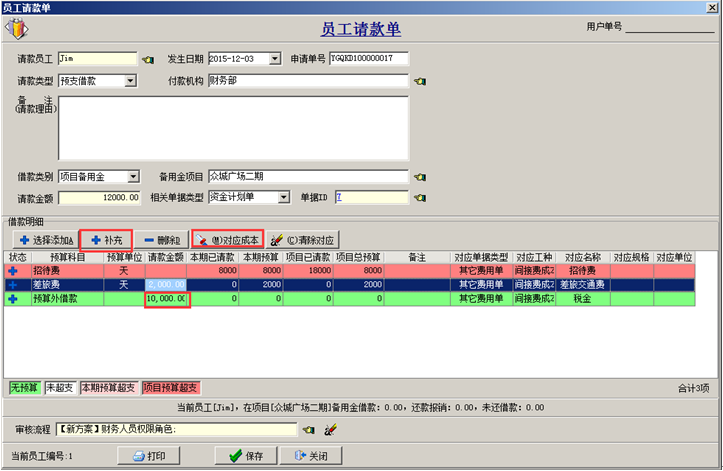 如果需要申請的預(yù)算科目在工程管理軟件的資金計(jì)劃單中沒有設(shè)置,可在“員工請款單中”進(jìn)行補(bǔ)充,點(diǎn)擊“補(bǔ)充”按鈕,對應(yīng)成本并輸入請款金額。在“員工請款單”申請項(xiàng)目備用金時(shí)。單據(jù)中補(bǔ)充的無預(yù)算的科目以“預(yù)算外借款”顯示顏色為綠色。如圖: