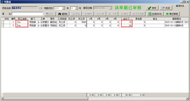 上面定義好公式后,下面我們做了一張考勤單,結果如下:
