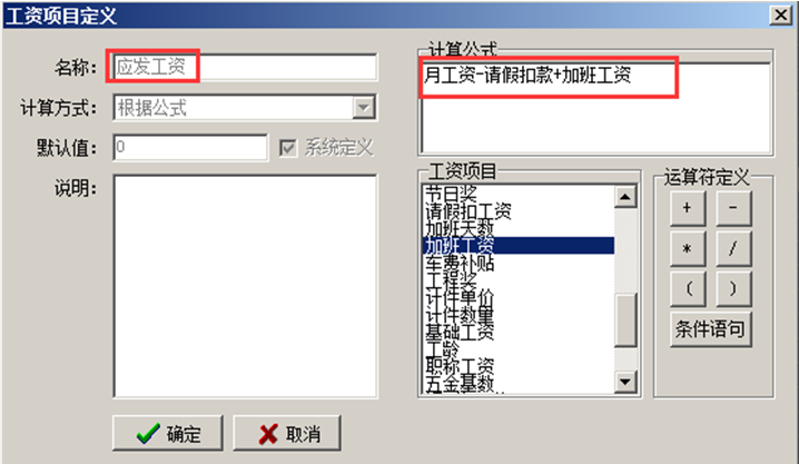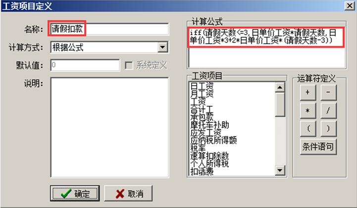 注:若在請假單或加班單中直接手動輸入請假扣工資或加班工資,在工資項目定義中直接帶入請假扣工資或加班工資,則無需定義相關公式。
