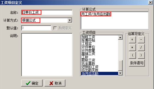 1、先在工資項目定義中增加兩個科目:日單價工資,當月應出勤。如圖: