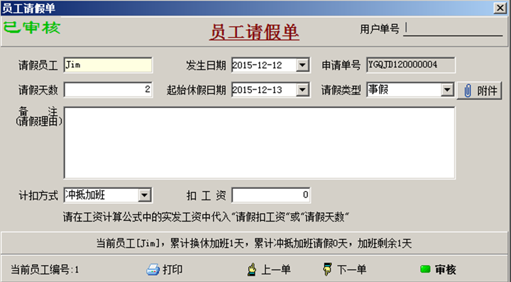 注:“扣工資”金額這里不用填寫,因為在本例中【工資項目定義】中“請假扣工資”要通過公式來得出。如果,“請假扣工資”不根據(jù)【工資項目定義】公式計算,每張請假單單獨體現(xiàn)的話,這里需要填寫好“扣工資”金額。