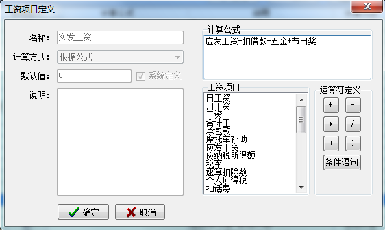 工資項(xiàng)目定義實(shí)發(fā)工資設(shè)置如下圖: