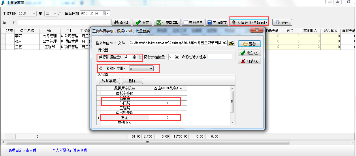 工程管理軟件 員工工資表的“批量替換”功能可將本地Excel表格中的工資數(shù)據(jù)替換到當(dāng)前的工資表中,可用于替換每月每人不同的工資項(xiàng)目,例如計(jì)件,計(jì)件工資,五金,節(jié)日獎(jiǎng)等。