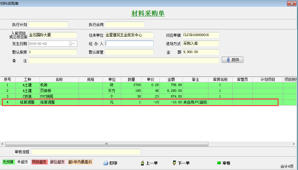 項(xiàng)目管理軟件設(shè)置結(jié)算調(diào)整金額時調(diào)增錄入正數(shù),調(diào)減錄入負(fù)數(shù)。供應(yīng)商優(yōu)惠10元則輸入-10,點(diǎn)擊確定調(diào)整完畢,此時材料采購單金額變?yōu)?900元。點(diǎn)擊查看,此時會發(fā)現(xiàn)材料采購單會多出一個結(jié)算調(diào)整的材料明細(xì)。如下圖: