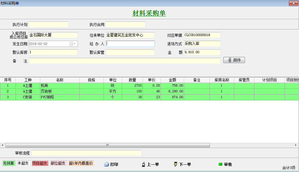 我們以項(xiàng)目管理軟件材料采購單為例,如圖新建一個材料采購單。