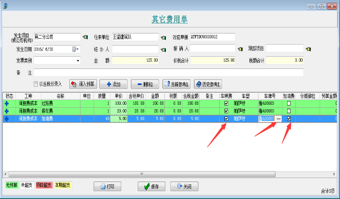 登記車輛日常費(fèi)用時,[車輛費(fèi)]、[車型]、[車牌號]為必選項(xiàng),如果為這項(xiàng)費(fèi)用為“加油費(fèi)”,則需要在[加油費(fèi)]上打鉤。