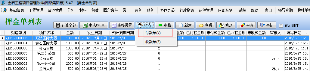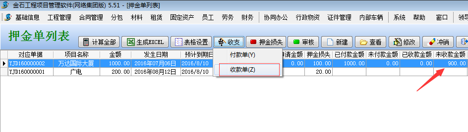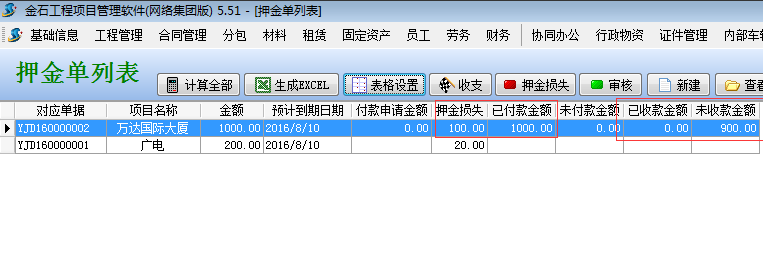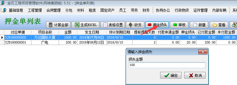 金石工程項目管理軟件押金管理未收款的計算原則: 押金已付款且“已到預(yù)計到期日期”,未收款金額=已付款金額—已收款金額—押金損失