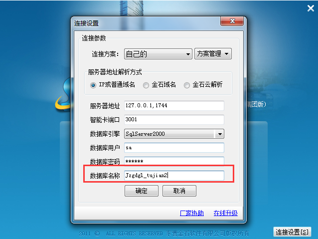 2.打開(kāi)金石客戶(hù)端→連接設(shè)置,更改下數(shù)據(jù)庫(kù)名稱(chēng)為我們還原的數(shù)據(jù)庫(kù)名稱(chēng)Jzgdgl_TuJian2