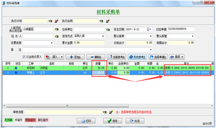 備注 如上圖所示:在備注欄中系統不但會自動彈出材料的計算方式,而且在數量一欄中只保留2位小數,并將第三位以后的數字舍去,以幫助公司節(jié)省開支
