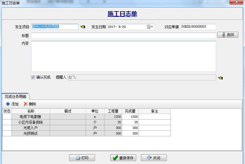 3、派工人員根據(jù)完成情況進行施工日志填報,“確認完成”打鉤可設置提醒人查看