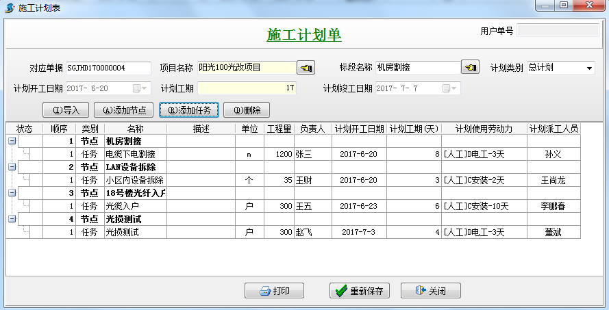 新建【施工計劃單】,先添加節(jié)點,在添加任務,輸入工程量、負責人、計劃開工日期等信息