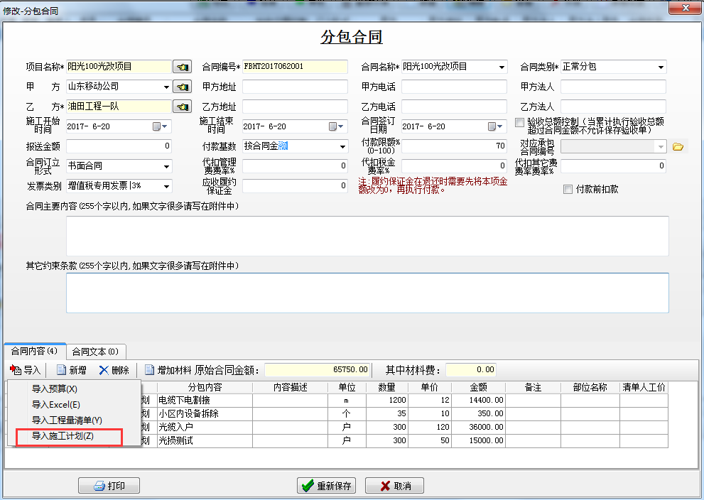 建立分包合同,導入施工計劃的內(nèi)容