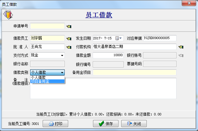 備注:員工借款分為個人借款和項目備用金,其中選擇項目備用金主要用于大額的采購,是??顚S玫模荒苡糜谄渌椖?/span>