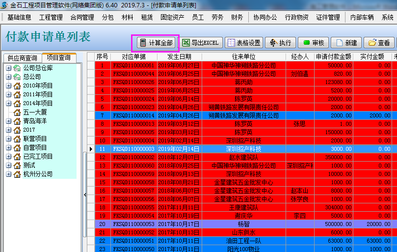 設(shè)置完成后點(diǎn)付款申請(qǐng)單列表中的“計(jì)算全部”這樣系統(tǒng)就會(huì)根據(jù)我們的設(shè)置彈出不同的顏色,就能快速的找到哪些沒(méi)有執(zhí)行付款、哪些已經(jīng)付款完成、哪些部分執(zhí)行付款。
