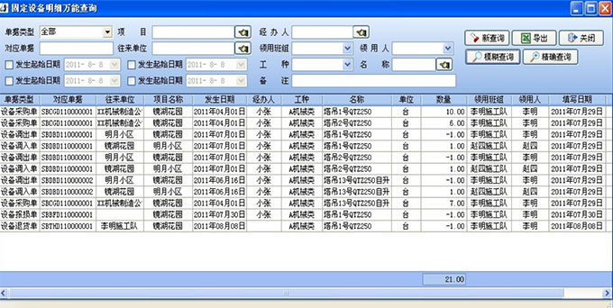 設(shè)備使用記錄功能主要由固定設(shè)備萬能查詢模塊實(shí)現(xiàn)。該模塊由相關(guān)機(jī)械設(shè)備負(fù)責(zé)人主持,在設(shè)備領(lǐng)用時(shí)登記相關(guān)信息,包括不限于:該設(shè)備對(duì)應(yīng)單據(jù)編號(hào)、往來的單位、設(shè)備調(diào)撥的歸屬項(xiàng)目,使用日期、登記信息的責(zé)任人、設(shè)備類別、具體的名稱、數(shù)量、領(lǐng)用班組、領(lǐng)用人、填表時(shí)間等信息。