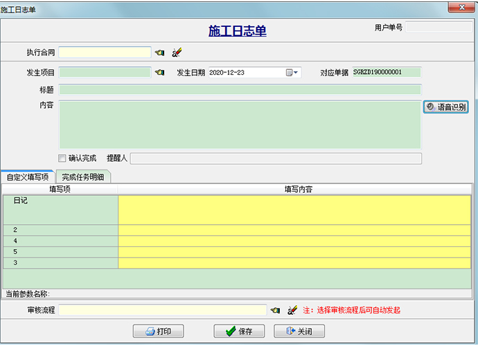 施工日志是施工方用于記錄工程項(xiàng)目真實(shí)情況,反饋一線信息的重要資料,也是施工管理軟件中進(jìn)度來(lái)源,金石軟件的施工日志模塊為每個(gè)任務(wù)提供明細(xì)反饋,并根據(jù)工地的實(shí)際情況,設(shè)計(jì)了語(yǔ)音識(shí)別功能,用戶可以通過(guò)語(yǔ)音簡(jiǎn)述項(xiàng)目情況,語(yǔ)音自動(dòng)識(shí)別為文字,減輕了工作量和工作難度。