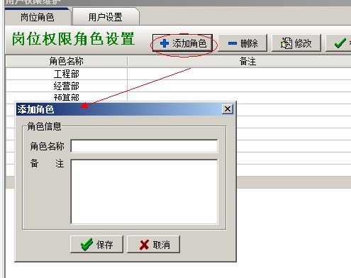 按【添加角色】按鈕,在彈出的窗口中設(shè)置崗位名稱及備注說明。