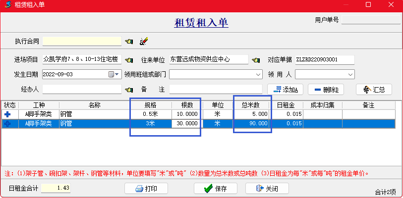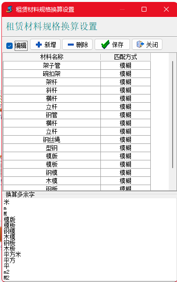【租賃材料規(guī)格換算設(shè)置】可實(shí)現(xiàn)自定義指定某些租賃材料的總長度換算、總面積換算、重量換算,并可以自動(dòng)去掉多余的字。