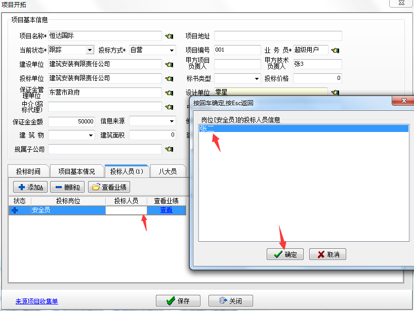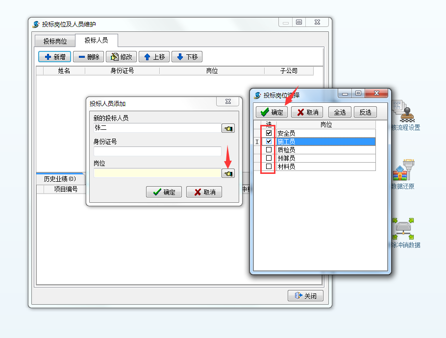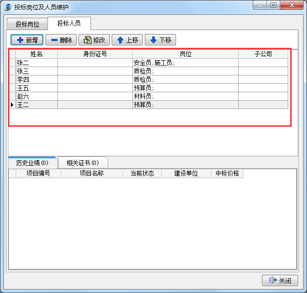 錄入好姓名后,選擇相對應(yīng)的崗位(選擇崗位時,可以一人設(shè)多崗),依次添加好投標(biāo)人員后,關(guān)閉該窗口,如下圖: