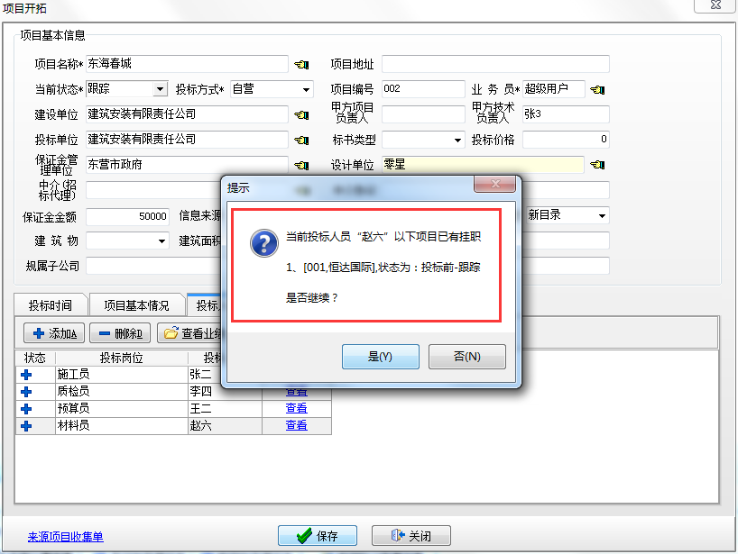 上圖中,張二、趙六兩個投標(biāo)人員已參與恒達國際的投標(biāo)項目,我們保存看下提示效果,如下圖: