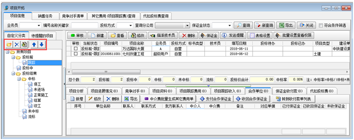 在工程項(xiàng)目管理軟件項(xiàng)目分類維護(hù)中,投標(biāo)前、投標(biāo)中、投標(biāo)結(jié)果(中標(biāo)、未中標(biāo)、流標(biāo)) 三個(gè)節(jié)點(diǎn)為系統(tǒng)定義,不可調(diào)整。只可以在此分類下建立子分類。
